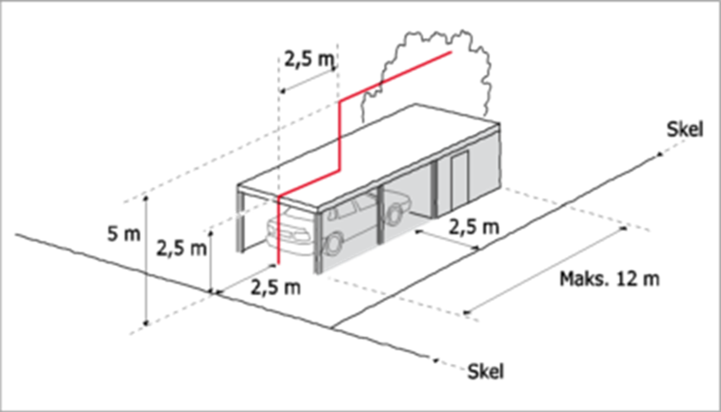 Bygninger som carporte, garager og udhuse må ikke placeres nærmere skel end 2,5 meter, må ikke være højere end 2,5 meter, og den samlede længde af de sider, der vender mod skel mod nabo, må ikke overstige 12 meter.