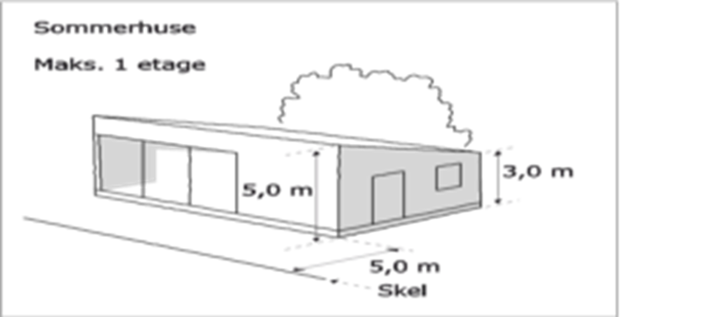 Billedet beskriver krav til længde og højde for mindre bygninger placeret i tilknytning til sommerhuse og inden for 5 meter fra skel.