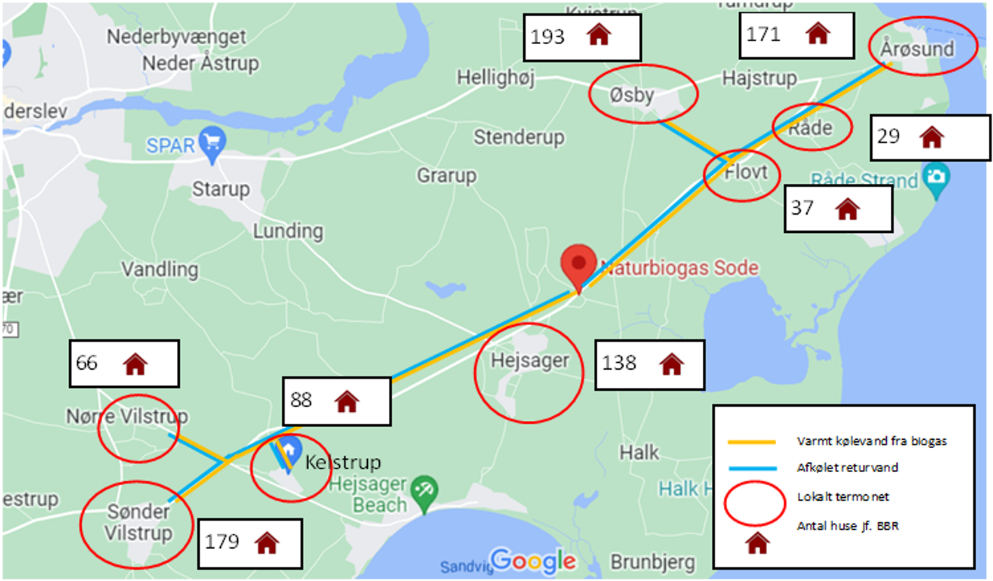 Kort over området, hvor der arbejdes på at etablere en lokal fælles varmeløsning. Projektet dækker over Øsby, Råde, Flovt, Hejsager, Kelstrup, Nørre Vilstrup og Sønder Vilstrup. Der arbejdes på at projektet skal bestå af et samlet net med overskudsvarme fra biogas og lokale termonet.